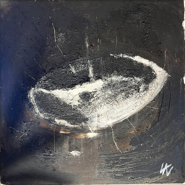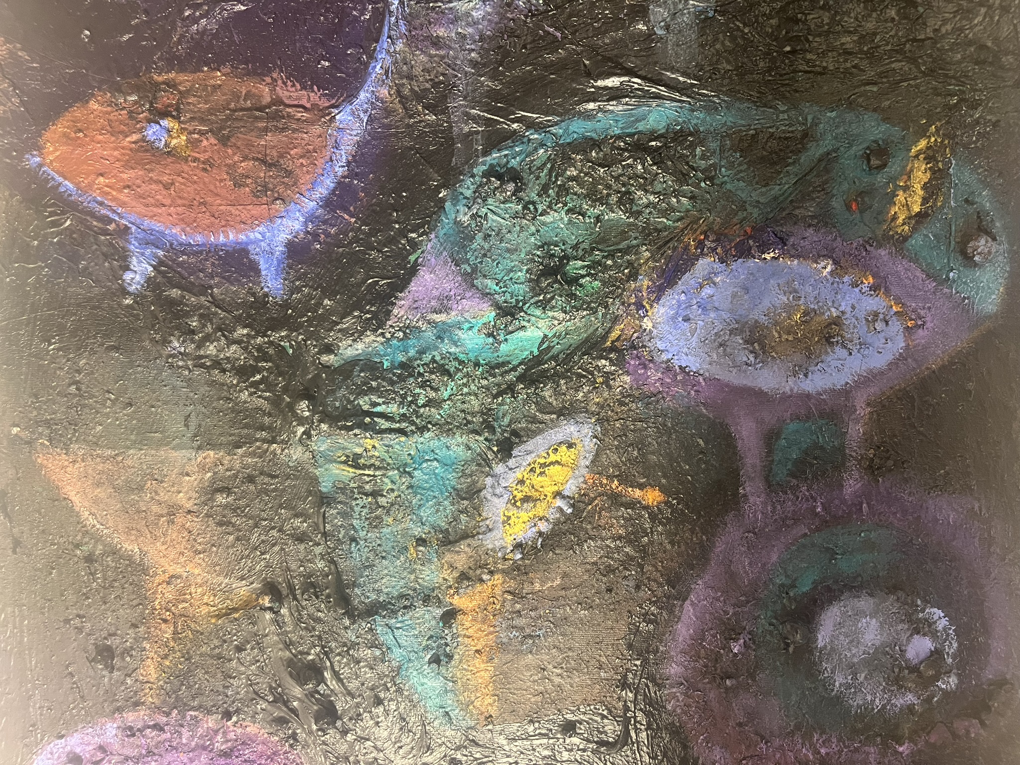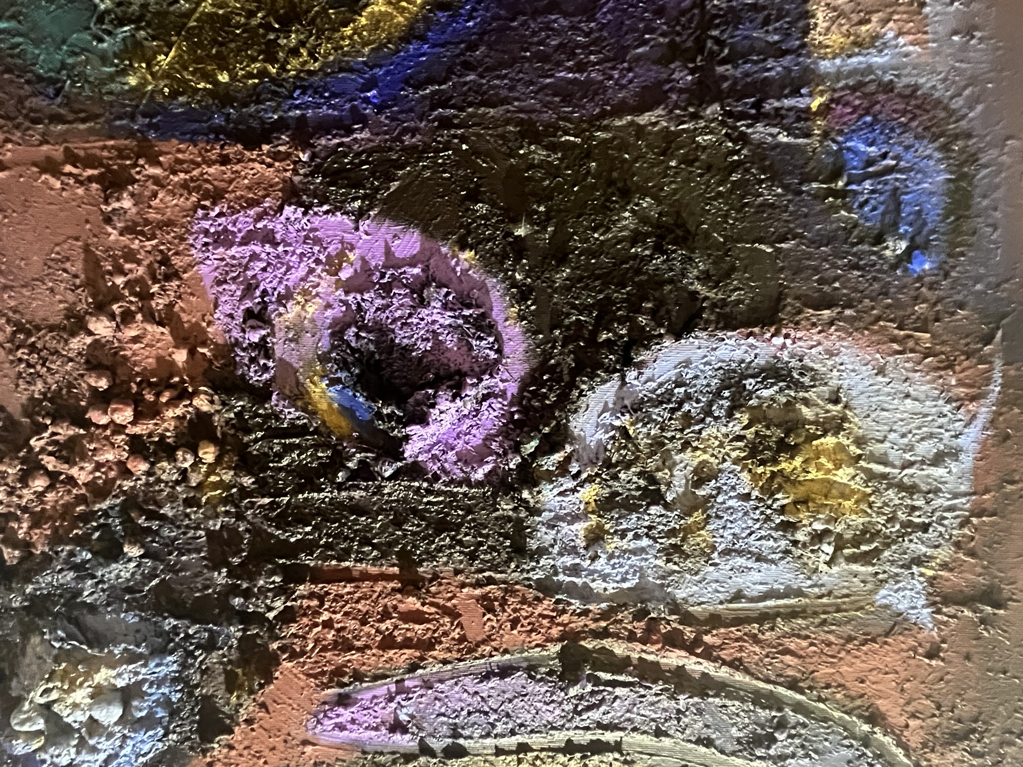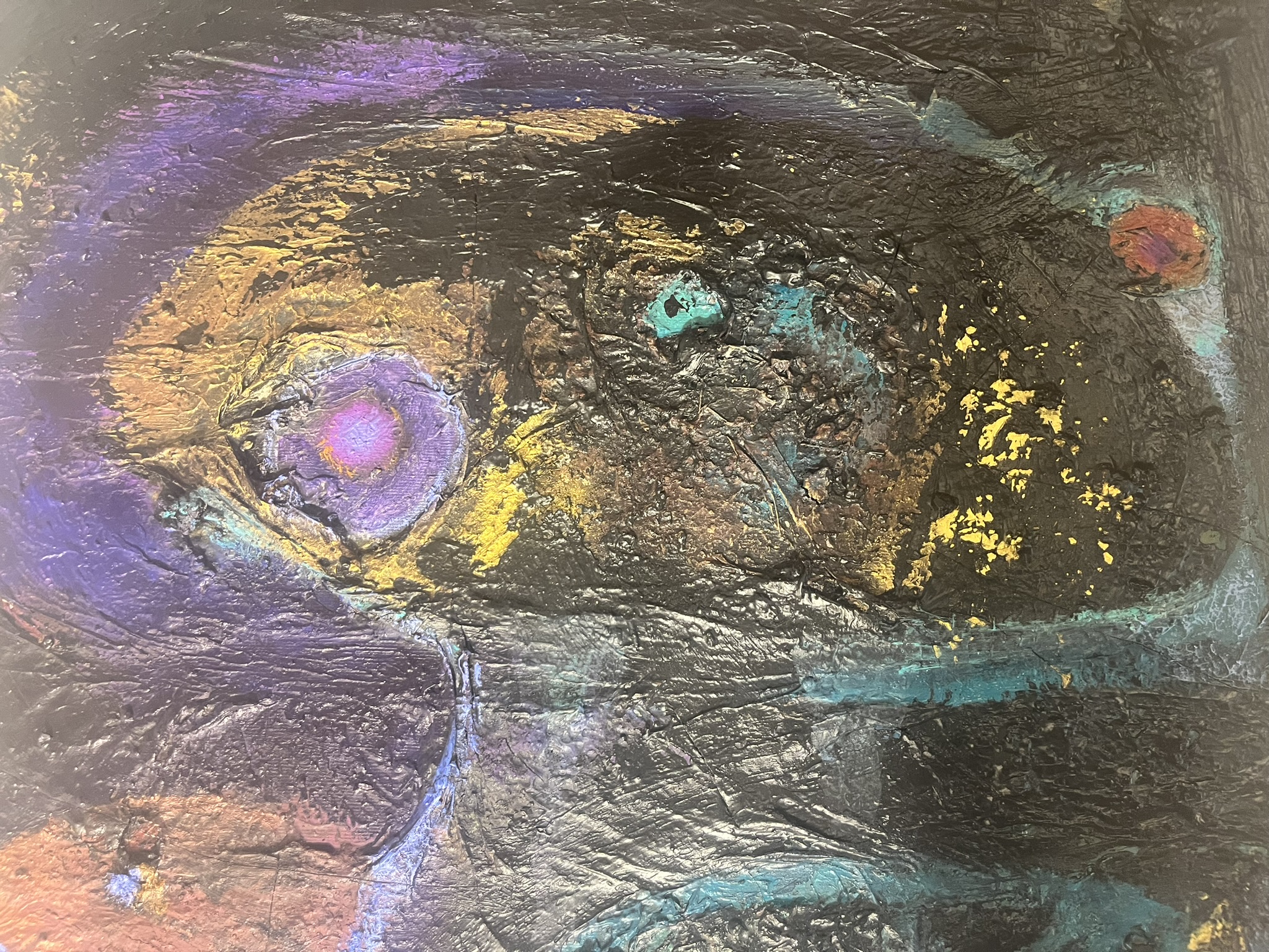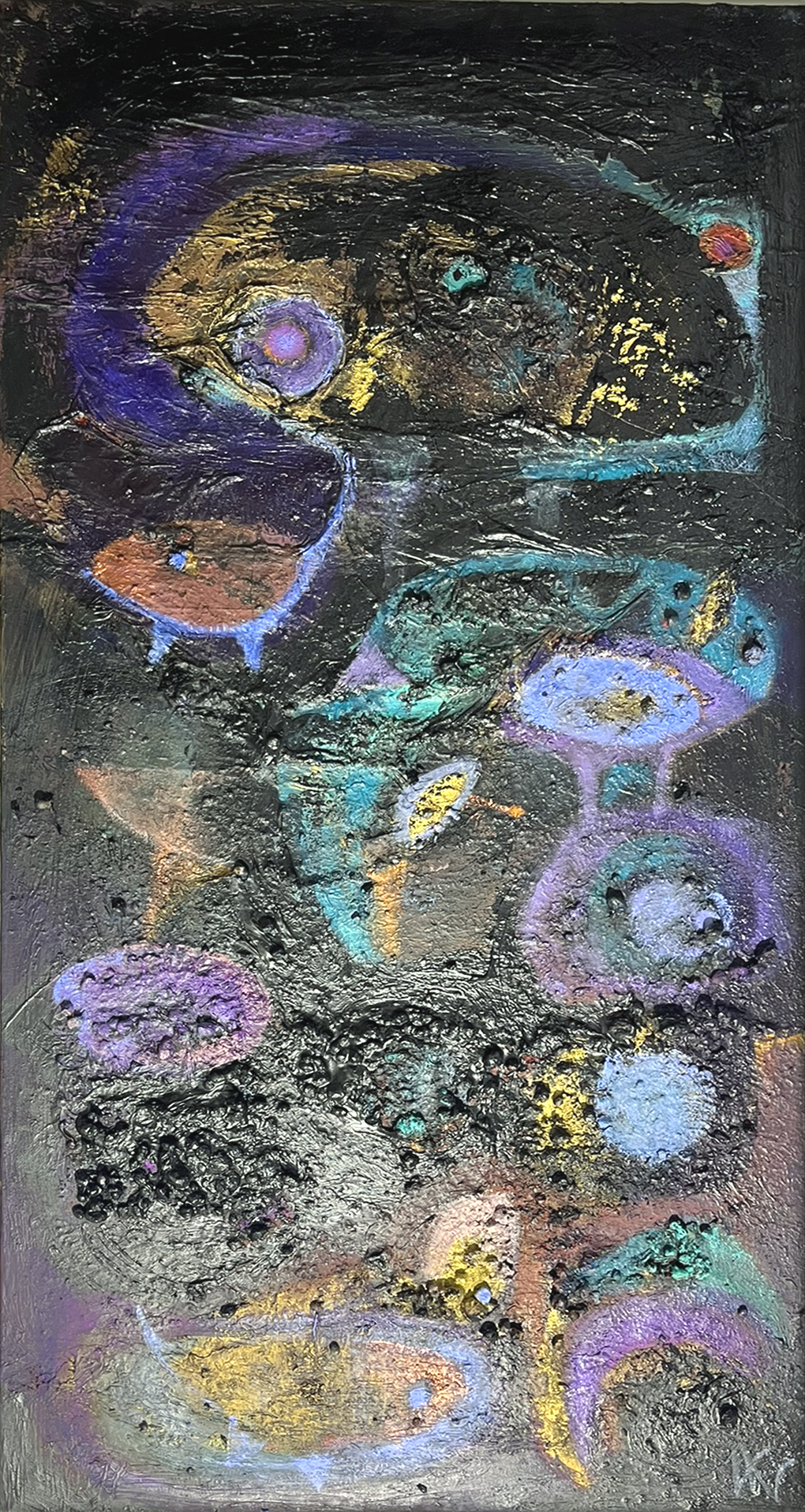 Sotterraneo, bitume, segatura, acrilico, pigmenti oro e rame su tela, 120×60, 2024