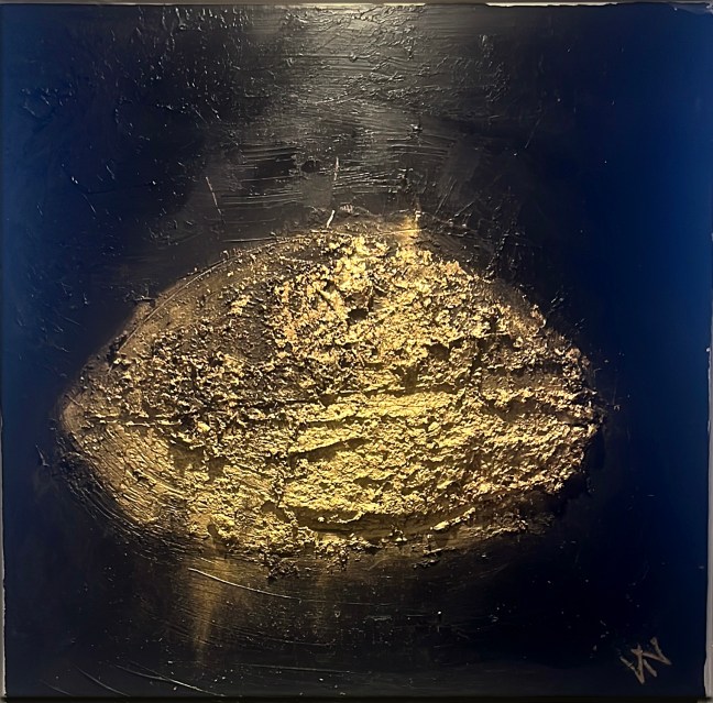 Sotterraneo1, bitume, segatura, acrilico, pigmenti oro e rame su tela, 120×60, 2024
